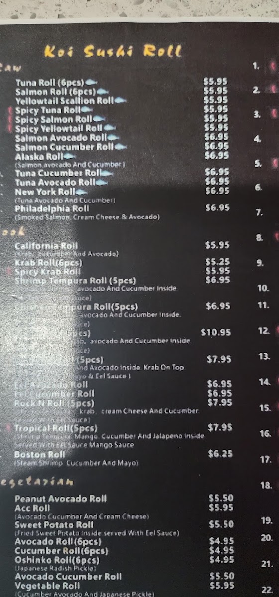 Tempura shrimp,avocado,carrot,cream cheese and cucumber w.sweet soy sauce.